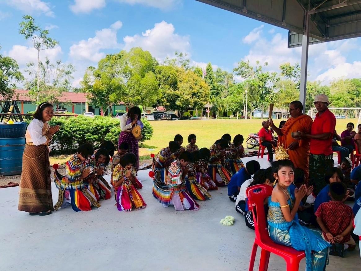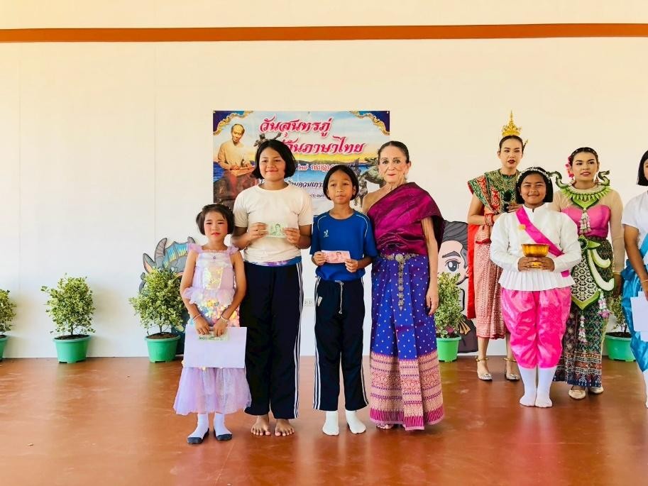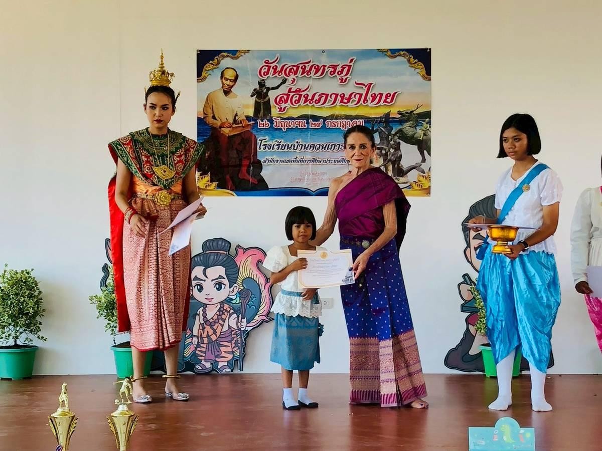 Dans la newsletter précédente j’avais évoqué cette célébration de la langue thaïe que nous avons donc célébrée en ce 9 août avec simultanément l’inauguration de Natacha Hall. Les professeurs avaient proposé aux enfants de composer une poésie, à d’autres d’interpréter des personnages ou des chansons anciennes. M’avait été destiné le personnage Maria Guyomar de Pina, « Thao Thong Kip Ma » qui signifie « Superviseur des instruments royaux ». Personnage réel, elle fut au XVIIe siècle la femme de Constantin Phaulkon. Ce dernier aura une influence importante auprès du roi Naraï dans le cadre des premiers échanges entre le Siam et la France dont nous célébrons cette année les 340 ans. Maria Guyomar sera entre autres la cheffe-cuisinière du Palais royal ! Elle est en particulier honorée comme la « Reine des desserts ».