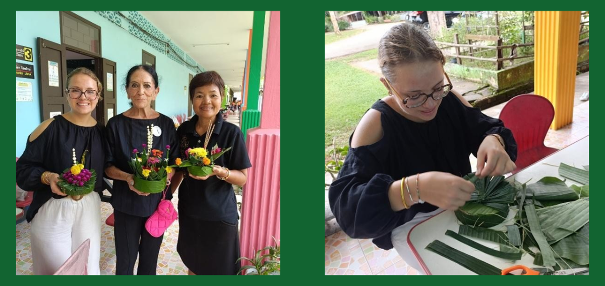 Animée d’un vrai don de pédagogue Marion a réussi à capter aussi bien les tout-petits que les grands grâce à son rayonnement exceptionnel. Elle avait en plus préparé ses cours en les axant non seulement sur l’initiation au français mais aussi à la prise de conscience de l’environnement. A peine avait-elle commencé son stage qu’elle reçut une formation accélérée pour la fabrication des Kratongs, ces offrandes que nous préparons avec amour tous les ans lors de la fête de Loy Kratong ( 12e pleine Lune dans le calendrier lunaire thaï, cette année c’était le 5 novembre).