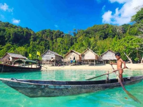 Photo prise devant les huttes sur pilotis d’un village Moken.