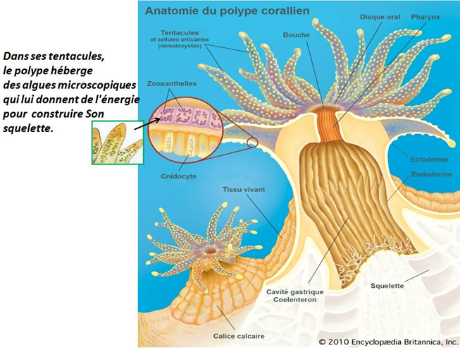 Dessin représentant la structure des loges coralienne et l’anatomie d’un polype.