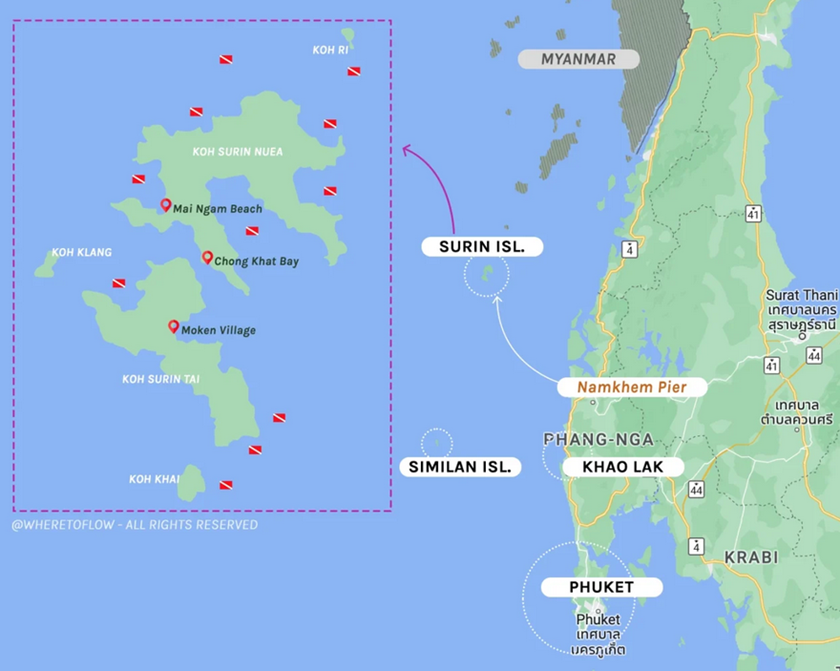 Situées à 60 kilomètres au large de la province de Phang Nga, les îles Surin forment un archipel d'une beauté saisissante : cinq îles principales entourées d'une mer turquoise, reliées par un réseau de courants qui assurent le brassage des larves et la régénération naturelle des coraux. Ce système océanique est un véritable corridor biologique, liant la Thaïlande aux archipels Mergui du Myanmar.