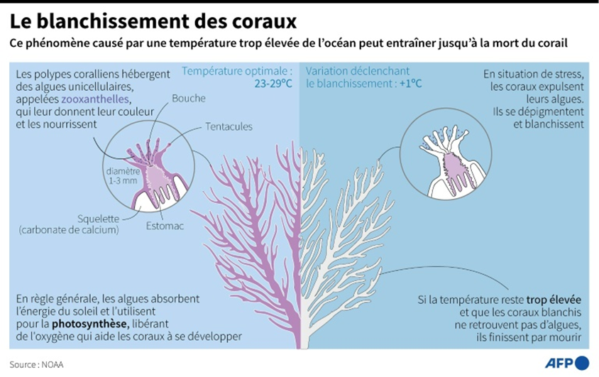 Il suffit parfois d'un écart presque imperceptible : +1 ou +2 °C au-dessus du maximum saisonnier. Pour l'algue, la photosynthèse devient toxique. Des radicaux libres s'accumulent. Le corail, pour survivre, expulse ses partenaires. Les pigments disparaissent. Le squelette blanc apparaît. C'est le blanchissement.
