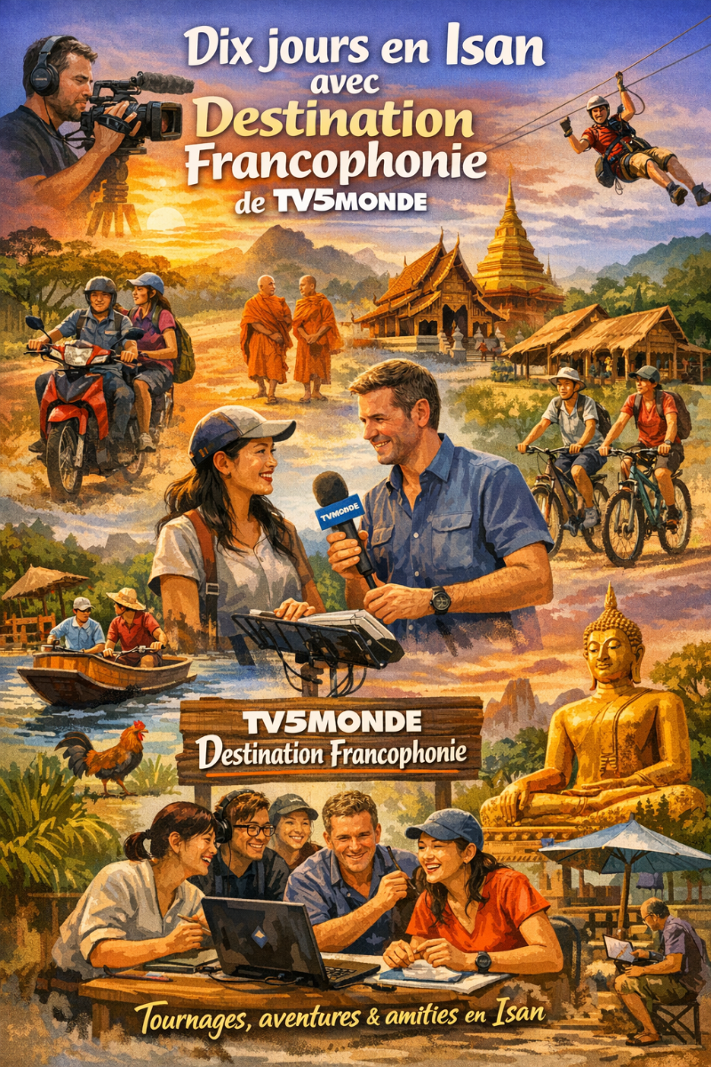 Dix jours. Dix jours hors du temps, rythmés par des levés à l’aube — quand le soleil hésite encore — et des couchers bien après qu’il ait abandonné la partie. Dix jours de tournage intense pour Destination Francophonie, au cœur de la région d’Isan, où l’énergie collective semblait inépuisable… même lorsque les corps, eux, réclamaient une pause.