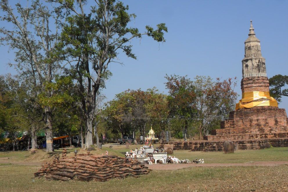 Le Wat Chaisi est en effet un exemple, il y a 25 ans, nous apprends Madame Brereton (en 1990 donc) il était à l’abandon faute de moines permanents depuis 30 ans. Il doit sa résurrection au Prakru Bunchayakorn, un moine natif du village de Sawatthi (สะวะถิ), retourné au village avec sa famille avec une aide tardive de « Tourisme autority of Thailand » et du département des beaux-arts. Nous devons avoir présent à l’esprit qu’il y a une quarantaine d’années, le temple était le centre et le cœur de la communauté villageoisen centre spirituel, lieu de rassemblement, école, dispensaire médical, champs de foire. La plupart des hommes était ordonnés moines « temporaires » après avoir reçu leur éducation au temple. Mais depuis 40 ans, le nombre de moines a diminué de moitié… Et les communautés villageoises ont été par le pouvoir central conditionnées pour penser que s’ils construisaient les temples comme leurs aïeux, ils auraient l’air de provinciaux c’est-à-dire de bouseux, alors place aux modèles de Bangkok.