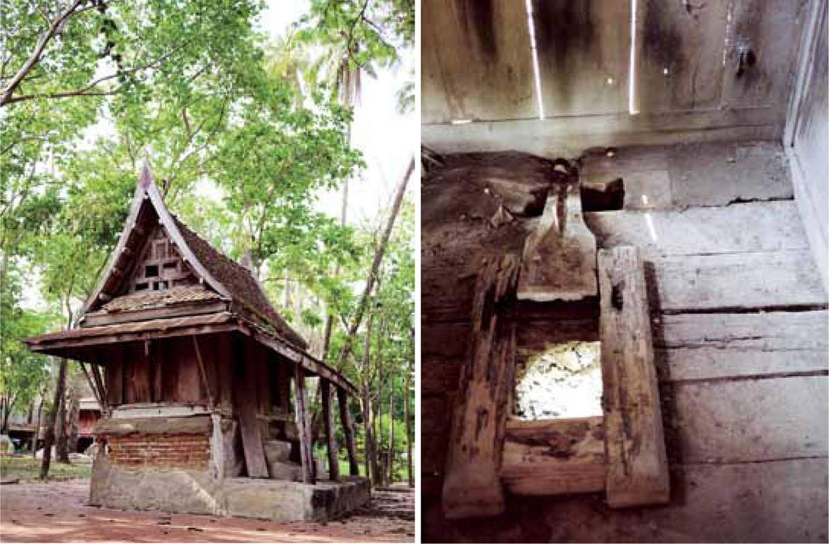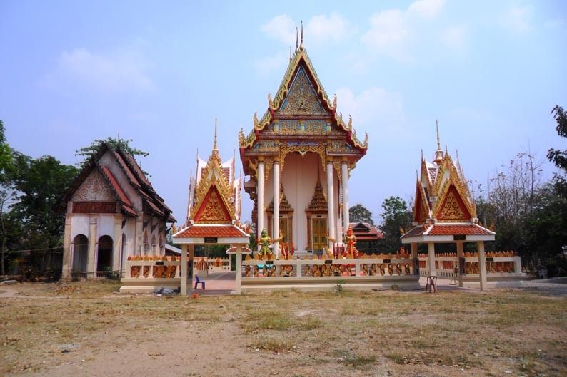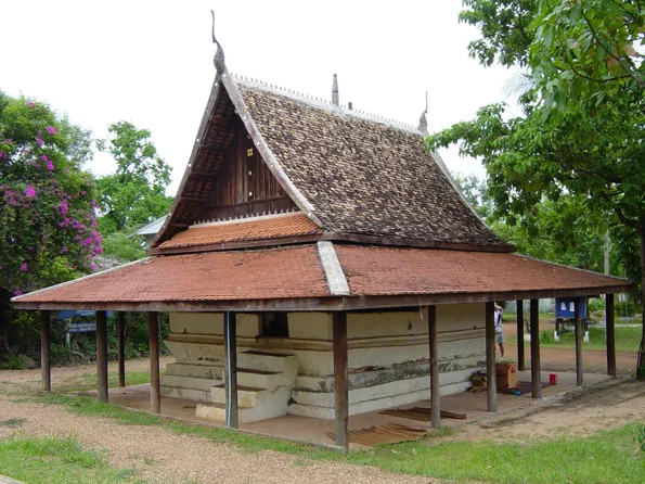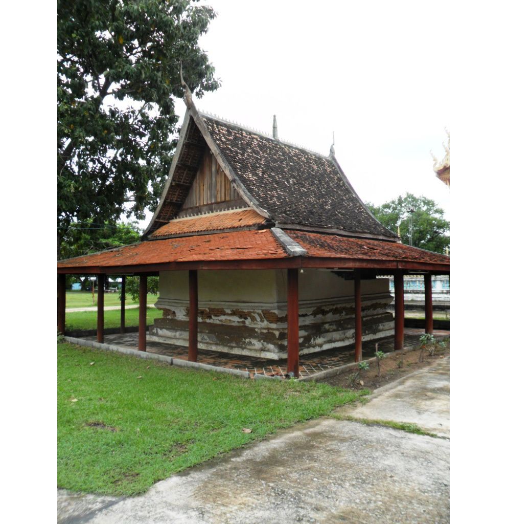 Ainsi la très modeste chapelle du Wat Klangkhokkho de Yangtalat (วัดกลางโคดค้อ -ยางตลาด) est datée de 1889 : petit bâtiment typique porté vers des poteaux en bois orienté vers une statue de Bouddha dont les murs sont restés blancs faute de moyens financiers :