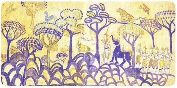 Les visages des personnages masculins sont dessinés de profil, ce qui donne une impression de mouvement et d’énergie (technique de nos bandes dessinées !). En revanche, les femmes et les mâles spirituellement supérieurs, tels que le Bouddha, sont dessinés de face ou de trois-quarts face ce qui leur donne une attitude paisible. On trouve souvent hommes et femmes dessinés dans des poses similaires au « tribhanga » de la sculpture traditionnelle indienne.