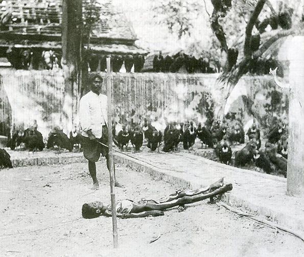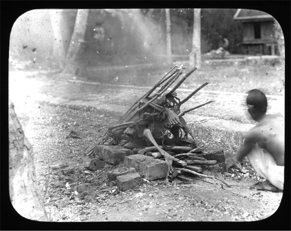 Il fut un temps ou les Siamois pratiquaient l’inhumation en pleine terre mais elle concernait ceux qui étaient morts « de mauvaise mort », enfants mort-nés, victimes de maladies contagieuses, morts de morts violents, femmes mortes en couche. Il semble que cette pratique ait totalement disparue pour une raison assez claire : les conditions de la mise en terre à fleur de sol faisaient que les dépouilles étaient rapidement déterrées par les chiens – l’un des fléaux de la Thaïlande – qui se disputaient ensuite leurs restes avec les vautours. S’ils ne l’étaient pas par les chiens, ils l’étaient par les sorciers avides de cadavres frais pour composer leur pommade magique (5). Monseigneur Pallegoix nous fait une description de la combustion sur le bucher : « ... le cadavre étant mis sur le bucher, on allume le feu. Les nerfs étant contractés, le mort semble s’agiter et rouler au milieu des flammes. C’est un spectacle horrible à voir… » (6).