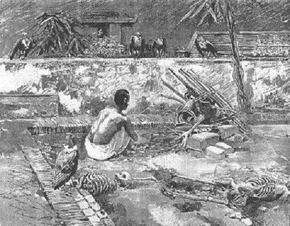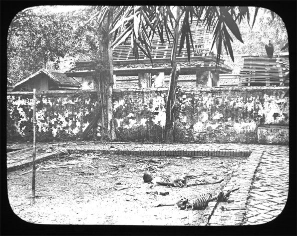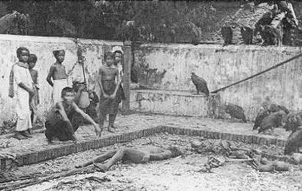 Une coutume qui semble avoir été spécifique à Bangkok nous est rapportée par Aymonier : « Une pratique, très rare au Cambodge actuel, mais fréquente au Siam, surtout à la capitale, consiste à léguer par piété sa chair à la voracité des vautours. Tous les voyageurs européens signalent le repoussant spectacle qui s'étale presque quotidiennement au Vat Saket de Bangkok, pagode qui a la triste spécialité de cette répugnante coutume » (7). Rama V avait interdit les crémations sur bucher dans la capitale et, surtout, ce qui était beaucoup plus fréquent, l’abandon pur et simple des dépouilles mortelles au bord des voies ou dans les canaux (4). Effectivement, le Vat Saket (วัดสระเกศ) comprenait à la fois un « champ crématoire » proprement dit…. et un charnier (rèng khét แร้งเขต « le champ des vautours ») au bord duquel trépignaient des rangées de vautours faisant claquer leur bec crochu en trépignant. Nous en devons une photographie à Fournereau toujours dans le cadre de sa mission.
