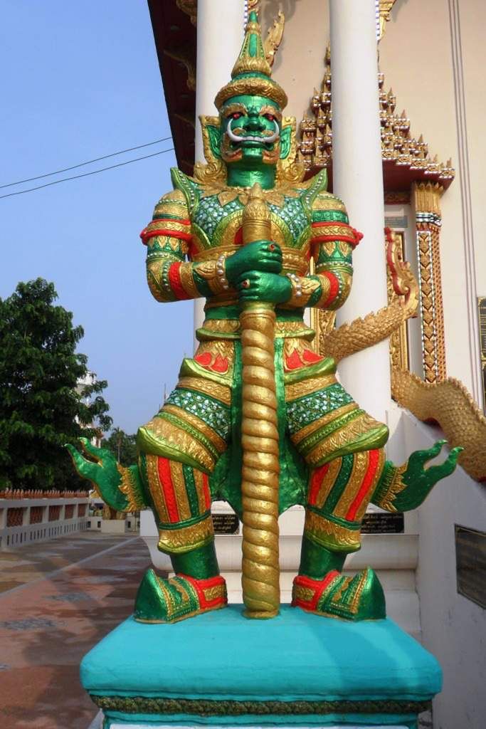Les Thévada (เทวดา « créatures célestes ») anges ou démons, fées, sorcières ou sorciers, sexués en tous cas, sont une multitude dans la mythologie venue des Indes. On les trouve souvent gardiens de l’entrée des bâtiments, géants évidemment, aux côtés des Naga. En l’un des quatre qui veille sur l’entrée de l’Ubosot du Vat klang de Huaymek il nous a bien semblé reconnaître le farouche Hamuman (หมุมาน) le fidèle compagnon de Rama. Il nous faudrait une vie d’homme pour faire un inventaire exhaustif de ces créatures célestes que l’on trouve dans le Ramakian, version siamoise du Ramayana.
