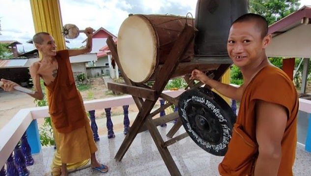 Un moine frappe la cloche au Vat phositaram (วัดโพธิ์ศรีตาราม) sous district de Banphon - district de Nonnongphue, province de Yasothon (บ้านพอก - โนนนองผือ - จังหวัดยโสธร)