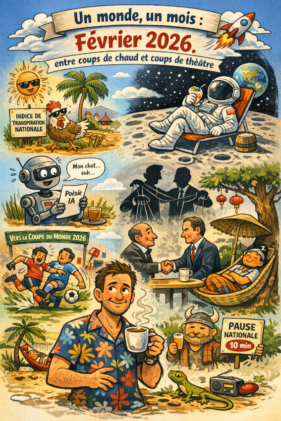 Février 2026 s’achève, et on ne sait toujours pas très bien si ce mois était censé être court pour nous laisser souffler… ou pour éviter qu’on se rende compte qu’il ressemblait furieusement à une saison entière de télénovela. À croire que le calendrier a décidé de nous ménager : “28 jours, pas un de plus, sinon ils vont demander un remboursement”. Pendant que les amoureux du 14 février se remettaient de leurs bouquets hors de prix et de leurs chocolats fondus (merci la canicule précoce), la planète, elle, continuait son petit marathon d’absurdités.
